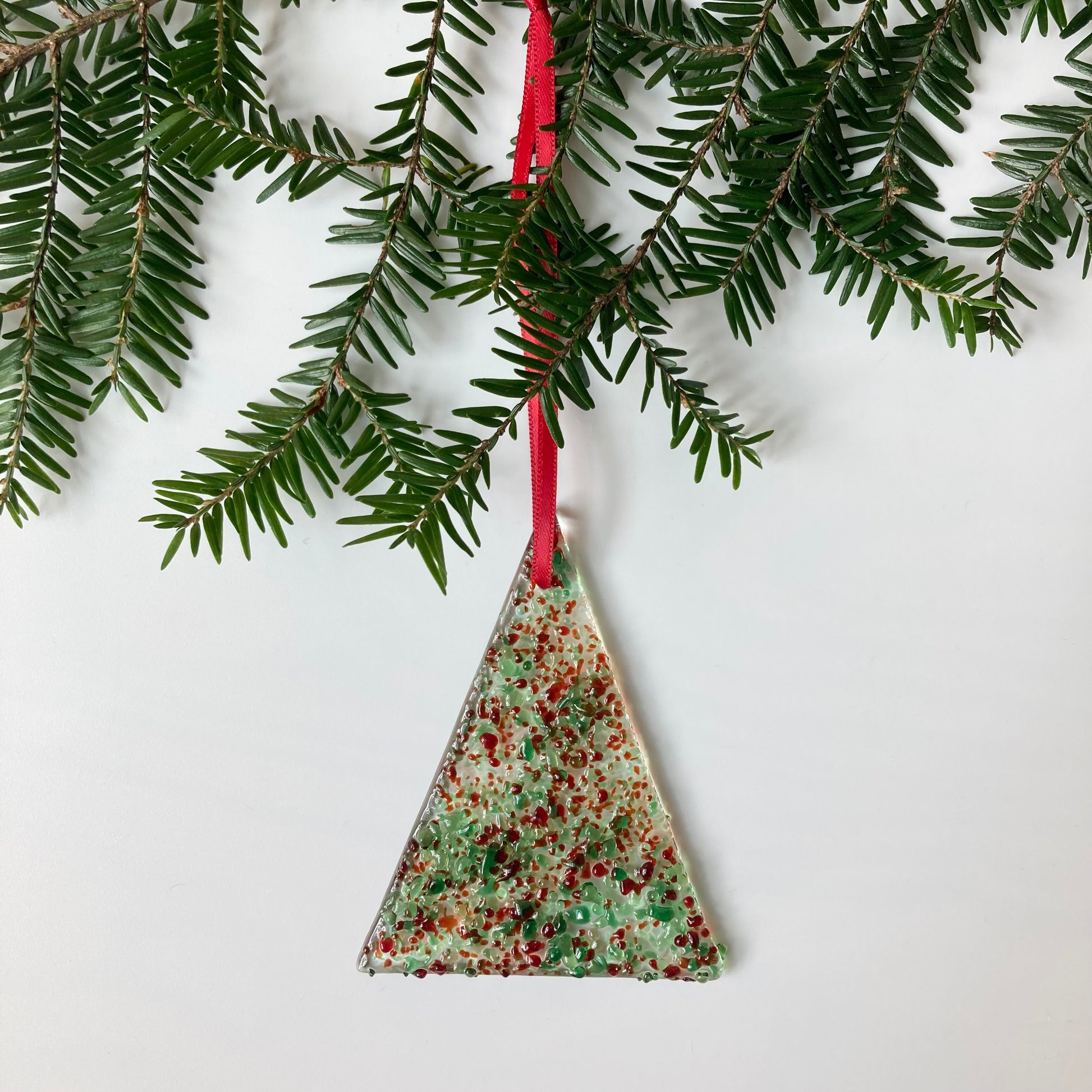 Handmade in Vermont, this festive red and green ornament adds holiday flair to the tree while staying clean and elegant. Small bits of broken glass are melted until smooth to the touch on a clear base, and the glass offers wonderful reflective qualities.